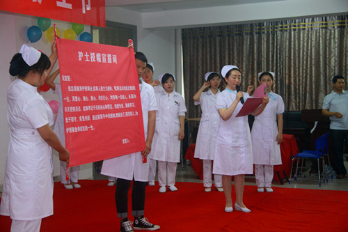 李勝利院長代表我院在會上作了講話,勉勵醫(yī)學系學生發(fā)揚南丁格爾精神,承擔起守護生命、守護健康的神圣使命,用勤勞的雙手和博大的愛心關愛病人,獻身醫(yī)學護理事業(yè)。隨后醫(yī)學系學生手舉著明亮的蠟燭,身著潔白的護士服,護理部主任方華、消化內(nèi)科護士長吳丹芬與醫(yī)學系護理老師一起給即將畢業(yè)的護生進行授帽并進行了宣誓。