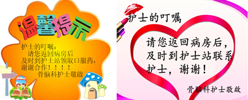 3、建立“溫馨提示牌”。病人在住院期間有一系列的溫馨提示。如:護(hù)士的叮嚀,我是照顧您的護(hù)士,發(fā)藥時(shí)您不在病房,返回后請(qǐng)及時(shí)到護(hù)士站聯(lián)系我,謝謝!骨腦科護(hù)理站敬啟。諸如此類(lèi)的提示牌,這些舉措進(jìn)一步加深了醫(yī)患溝通渠道,加強(qiáng)了新入院病人對(duì)環(huán)境的了解和熟悉,感受到醫(yī)護(hù)人員的關(guān)心,病人也很愿意接納這樣的方式,都主動(dòng)到護(hù)士站詢(xún)問(wèn)有關(guān)事項(xiàng)。