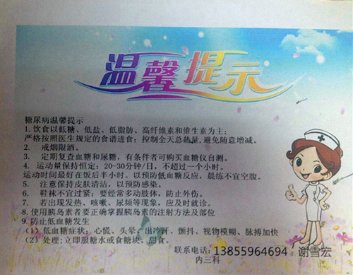 優(yōu)質(zhì)服務(wù)的開展拉近了我們與患者之間的距離,使我們之間的關(guān)系變得更加和諧,更加親密。我們科不僅僅是消化內(nèi)科,還是內(nèi)分泌科,這里住著一群“特殊”的病人,他們就是糖尿病病人,可是他們對糖尿病知識并不是十分了解,甚至會覺得有些恐懼!他們不知道如何飲食是健康并對身體有益的;不知道如何去控制血糖;不知道如何去預防低血糖。就此我們開展了糖尿病健康宣教。并且在此期間,我們制作了糖尿病溫馨提示卡,發(fā)放給每位糖尿病患者,并一一細心地去講解,讓他們懂得如何合理地進食,如何適當?shù)厝ミ\動,如何正確使用胰島素,如何科學地去預防低血糖,上面有我們的聯(lián)系方式,可以24小時為病友提供健康指導。我們的糖尿病患者逐漸認識到糖尿病其實并沒有想象中的那么可怕,看見他們?nèi)諠u舒展開來的笑容,我們也倍感欣慰。