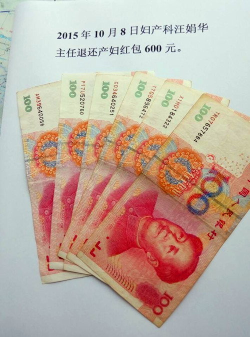 2015年10月8日,婦產(chǎn)科汪娟華主任查完病房,10床產(chǎn)婦汪俐華家屬塞給汪主任一個(gè)紅包,孕婦馬上要進(jìn)產(chǎn)房分娩,為了讓家屬放心,將600元紅包暫時(shí)收下交護(hù)士長(zhǎng),到收費(fèi)處替產(chǎn)婦汪俐華交辦了住院費(fèi)用手續(xù),汪主任看到母子平安,對(duì)他們說(shuō):治病是醫(yī)生本職,希望病人理解,安心養(yǎng)病早日出院,孕婦及家屬非常感動(dòng)。