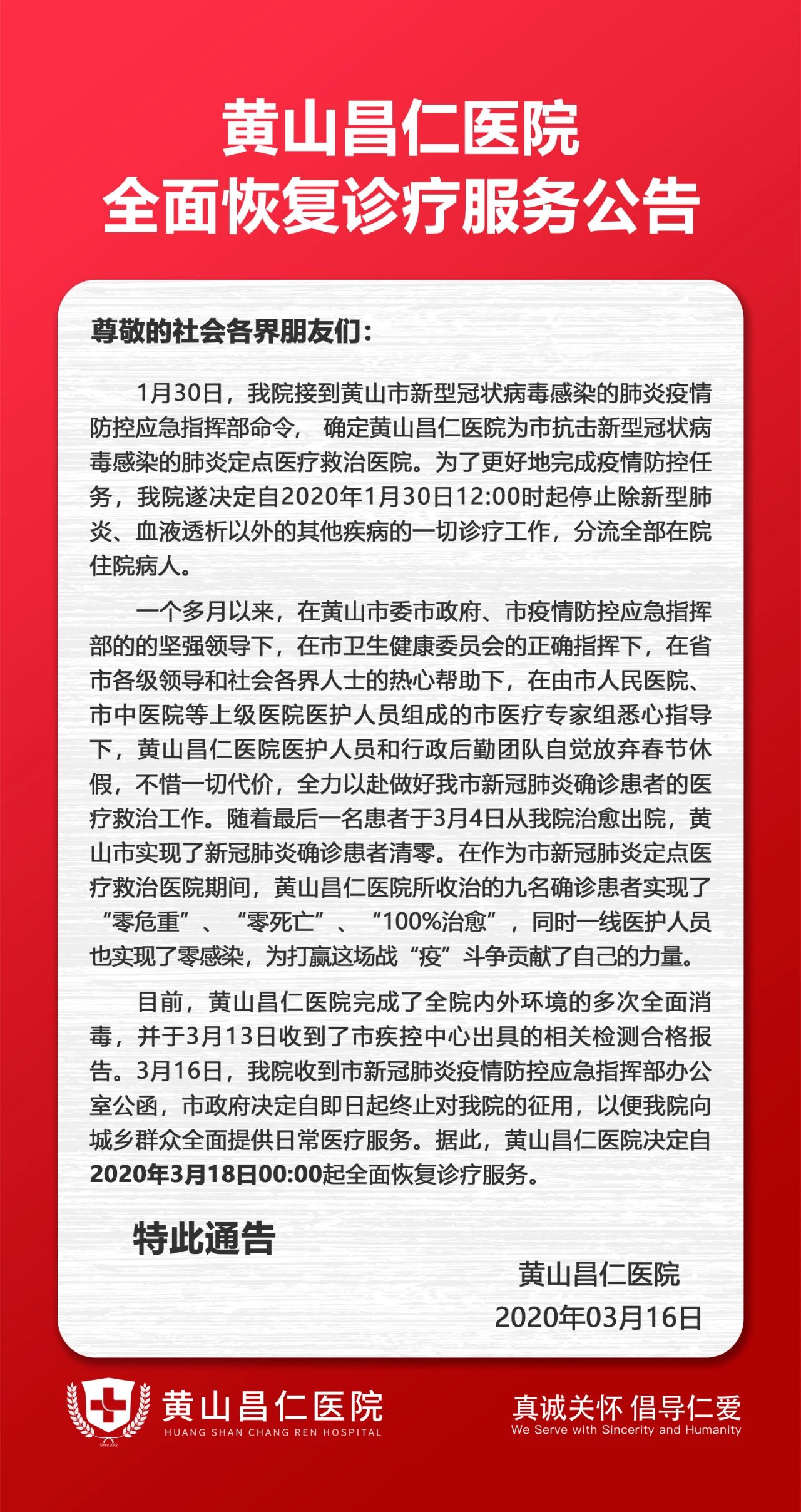 黃山昌仁醫(yī)院關(guān)于全面恢復(fù)診療服務(wù)的公告